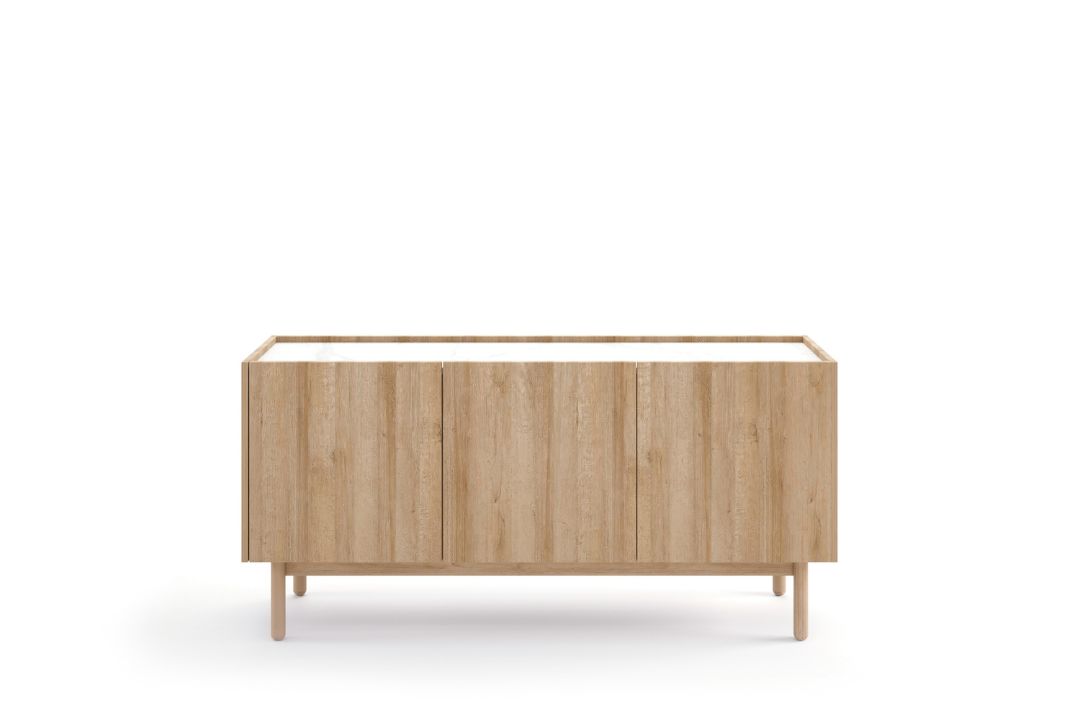 Η λευκή επιφάνεια μαρμάρινης όψης προσθέτει μια νότα πολυτέλειας, ενώ η απλότητα των γραμμών ενισχύει τον χαρακτήρα του επίπλου.