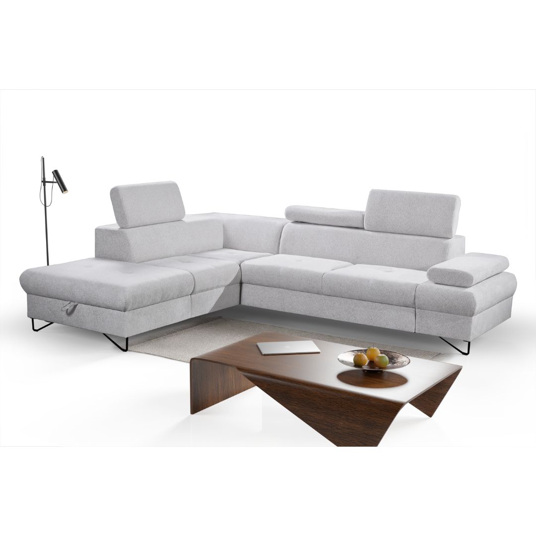 Ο γωνιακός καναπές FLAVO συνδυάζει κομψό μοντέρνο σχεδιασμό με υψηλή λειτουργικότητα. Διαθέτει ρυθμιζόμενα προσκέφαλα και μπράτσα, μηχανισμό υποβοήθησης για εύκολη μετατροπή σε κρεβάτι και μεγάλο αποθηκευτικό χώρο. Το κάθισμα με αφρό PUR και κυματοειδή ελατήρια εξασφαλίζει ανθεκτικότητα και άνεση, ενώ η επιφάνεια ύπνου των 195×124 cm καθιστά το FLAVO ιδανικό για καθημερινή χρήση.