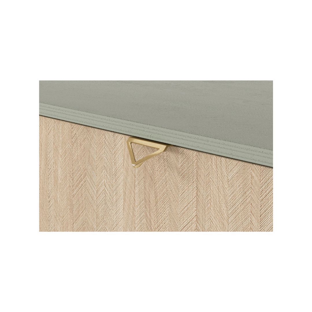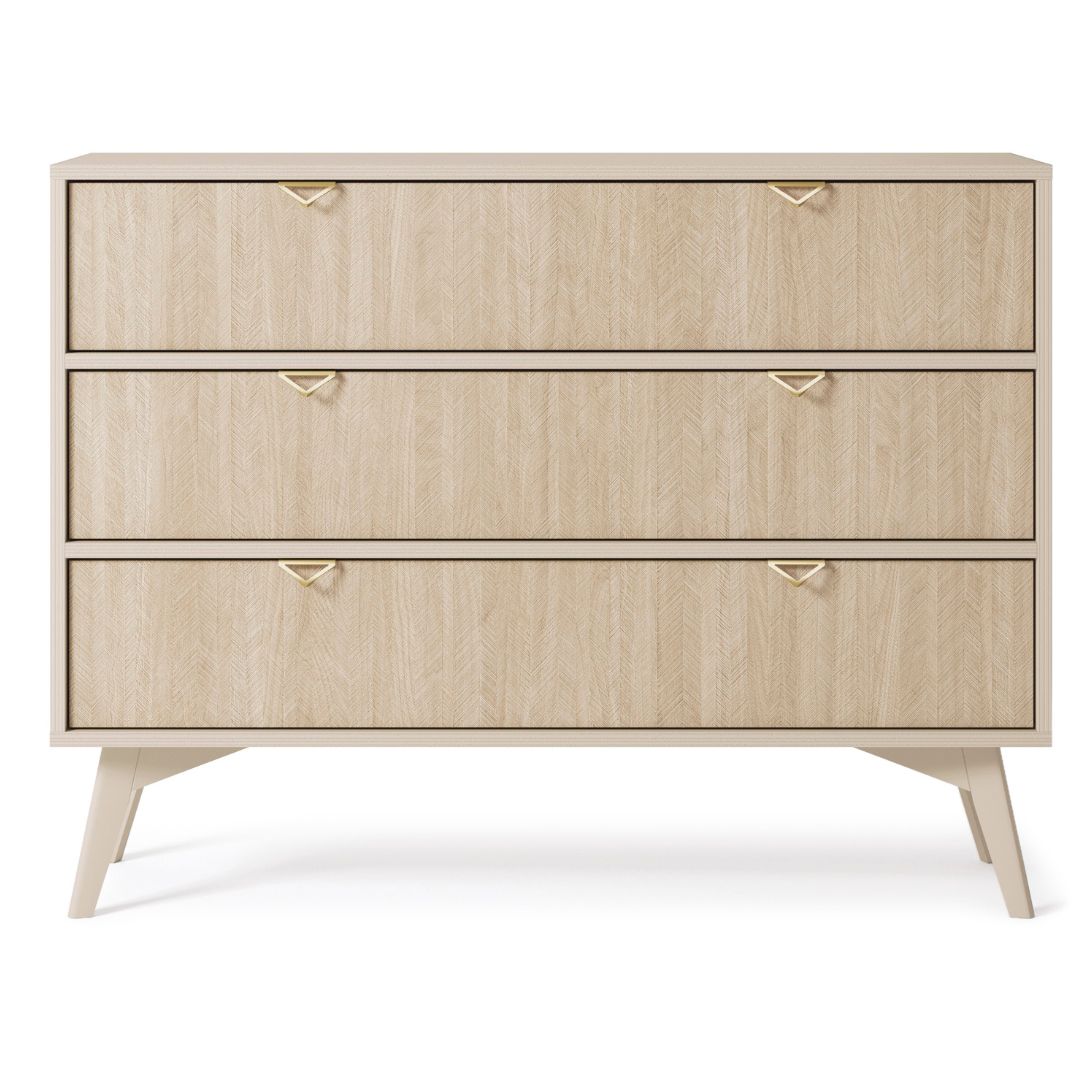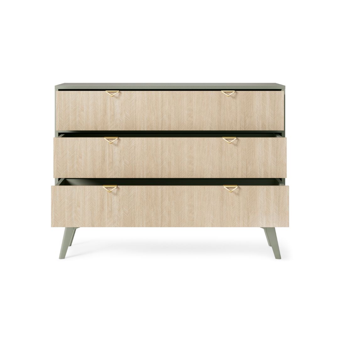 Κατασκευασμένη από υψηλής ποιότητας πλακέτα μελαμίνης με προστατευμένες ακμές ABS, εγγυάται αντοχή και πρακτικότητα. Διαθέτει ένα κλειστό τμήμα με ράφι και τρία συρτάρια με πλήρη εξαγωγή σε οδηγούς Hafele, για εύκολη και ήσυχη λειτουργία. Οι τριγωνικές χρυσές χειρολαβές και τα ξύλινα πόδια σε απόχρωση του κορμού προσθέτουν διακριτική πολυτέλεια και φωτίζουν το σχεδιαστικό στοιχείο.
