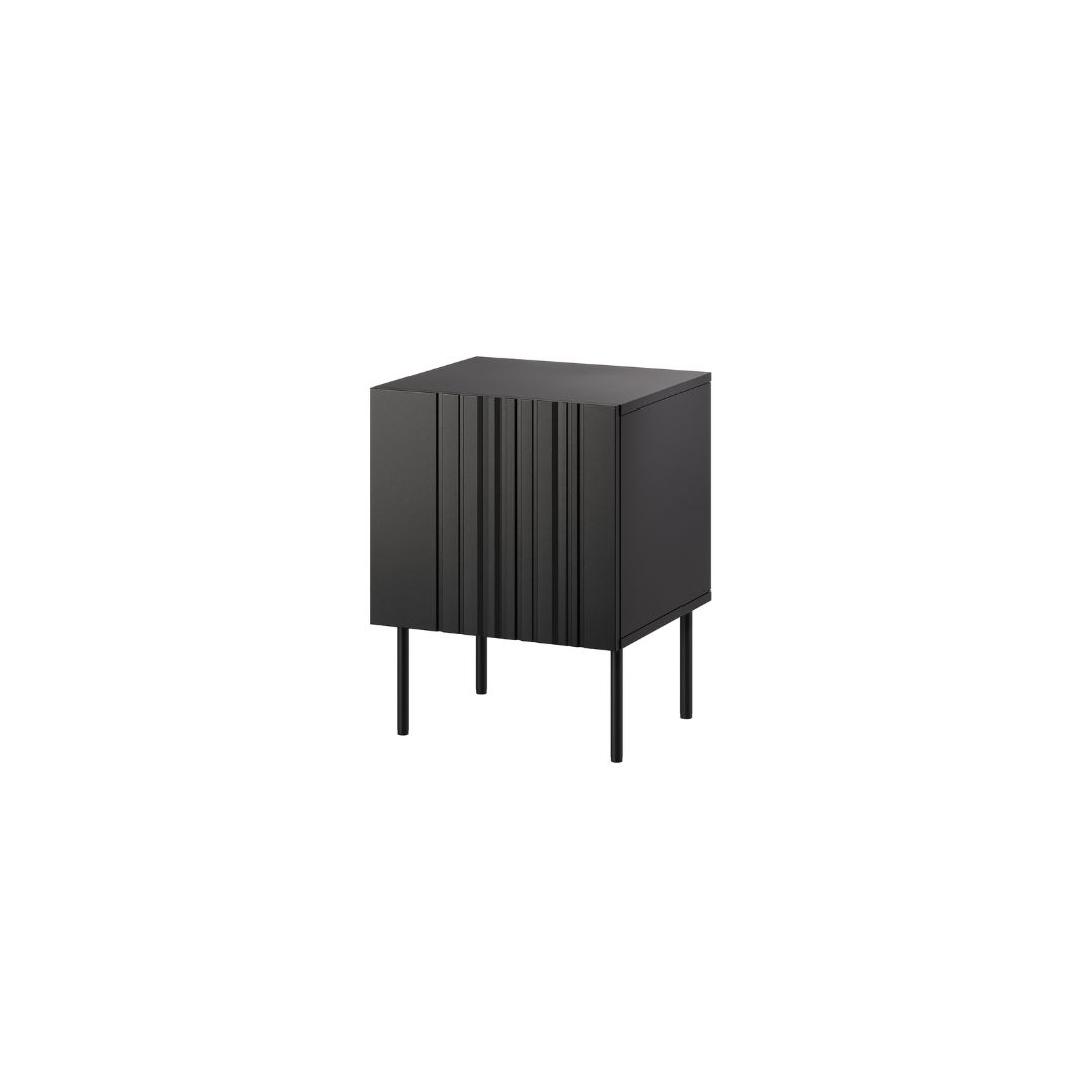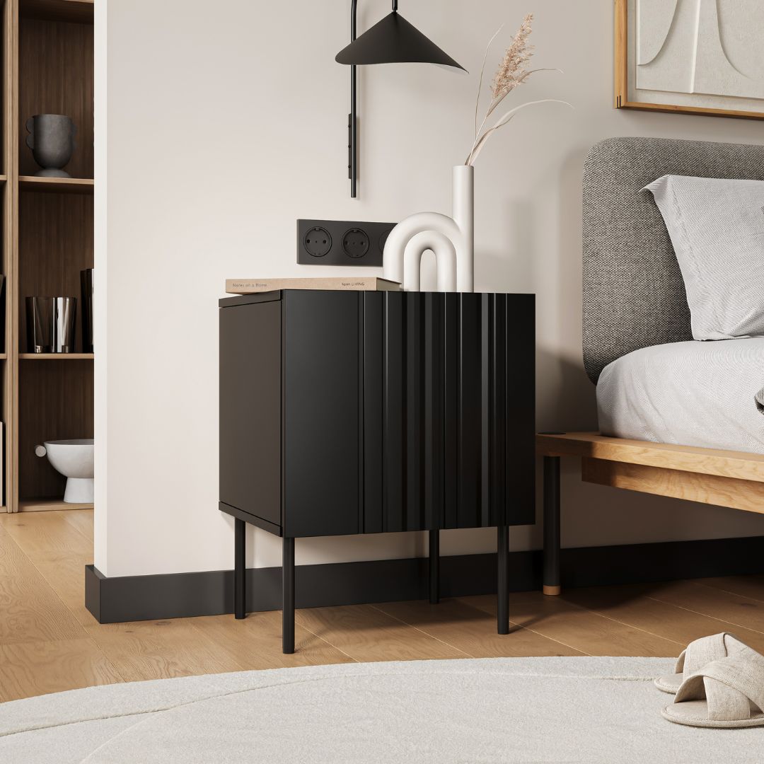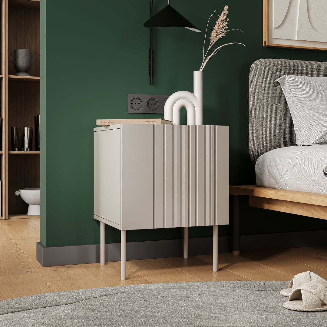 Η σειρά ISLA ξεχωρίζει για τα διακριτικά ριγέ/ριχτά μοτίβα (φρεζαρίσματα) στα μπροστινά μέρη, που προσδίδουν κομψότητα και μοντέρνο χαρακτήρα. Τα κομοδίνα συνδυάζουν μίνιμαλ σχεδιασμό με πρακτικότητα, διαθέτοντας σύστημα ανοίγματος push-to-open και κομψά μεταλλικά πόδια.