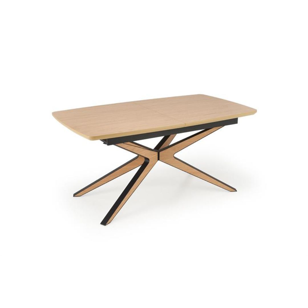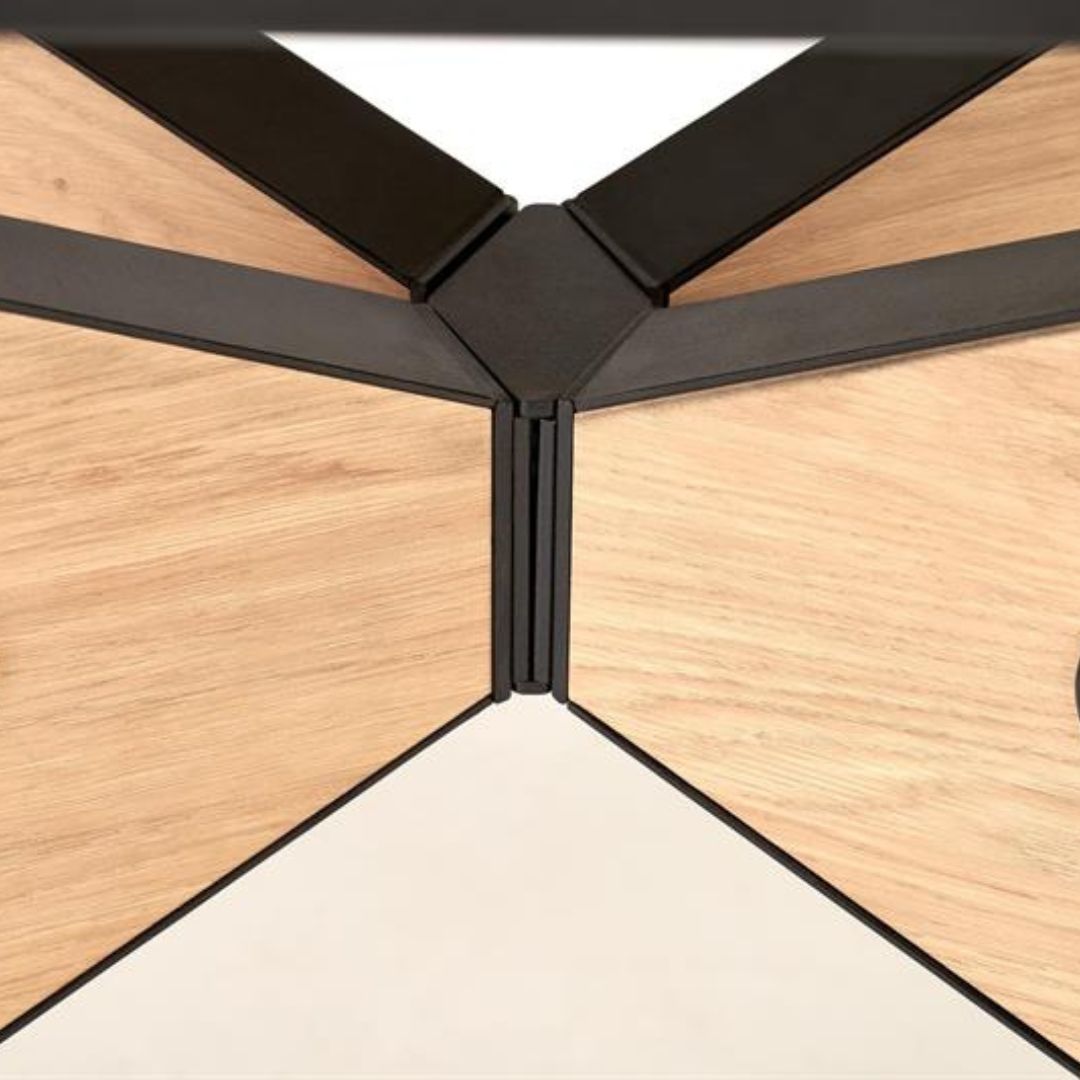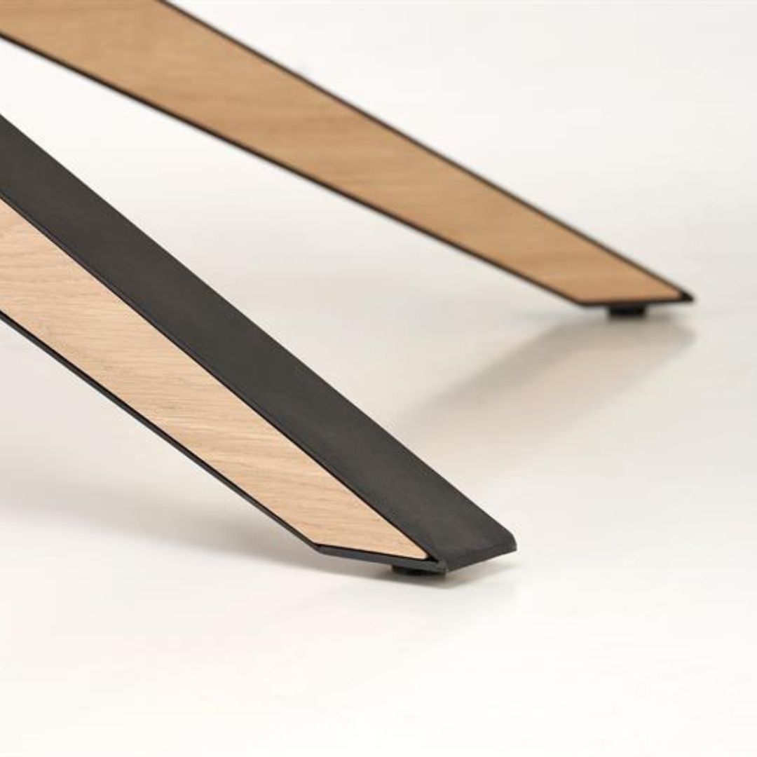 Η επιφάνεια του τραπεζιού είναι κατασκευασμένη από MDF επενδυμένο με μελαμίνη, προσφέροντας υψηλή αντοχή, προστασία από γρατζουνιές και ευκολία στη συντήρηση. Η φυσική απόχρωση της επιφάνειας προσδίδει ζεστασιά και φιλόξενη ατμόσφαιρα στον χώρο. Η στιβαρή βάση από ατσάλι με ηλεκτροστατική βαφή εξασφαλίζει σταθερότητα και σύγχρονη αισθητική.