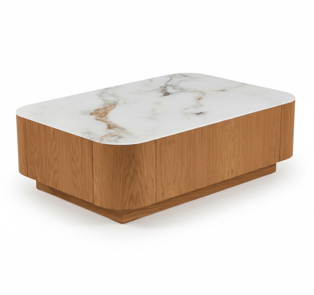 Τραπεζάκι σαλονιού με διαστάσεις 120 x 80 εκ., διαθέτει καπάκι σε όψη κεραμικού και βάση από ξύλο δρυός.