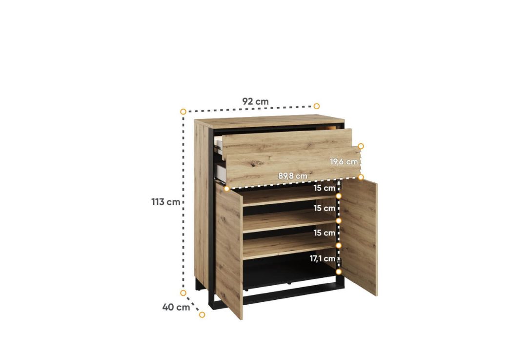 Χωρητικότητα: Διπλές πόρτες, δύο συρτάρια και τέσσερις εσωτερικές ράφες για έυκολη οργάνωση αντικειμένων όπως παπούτσια, αξεσουάρ, άλλα μικροαντικείμενα.