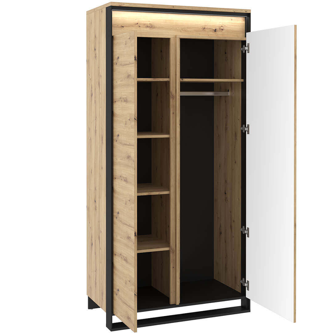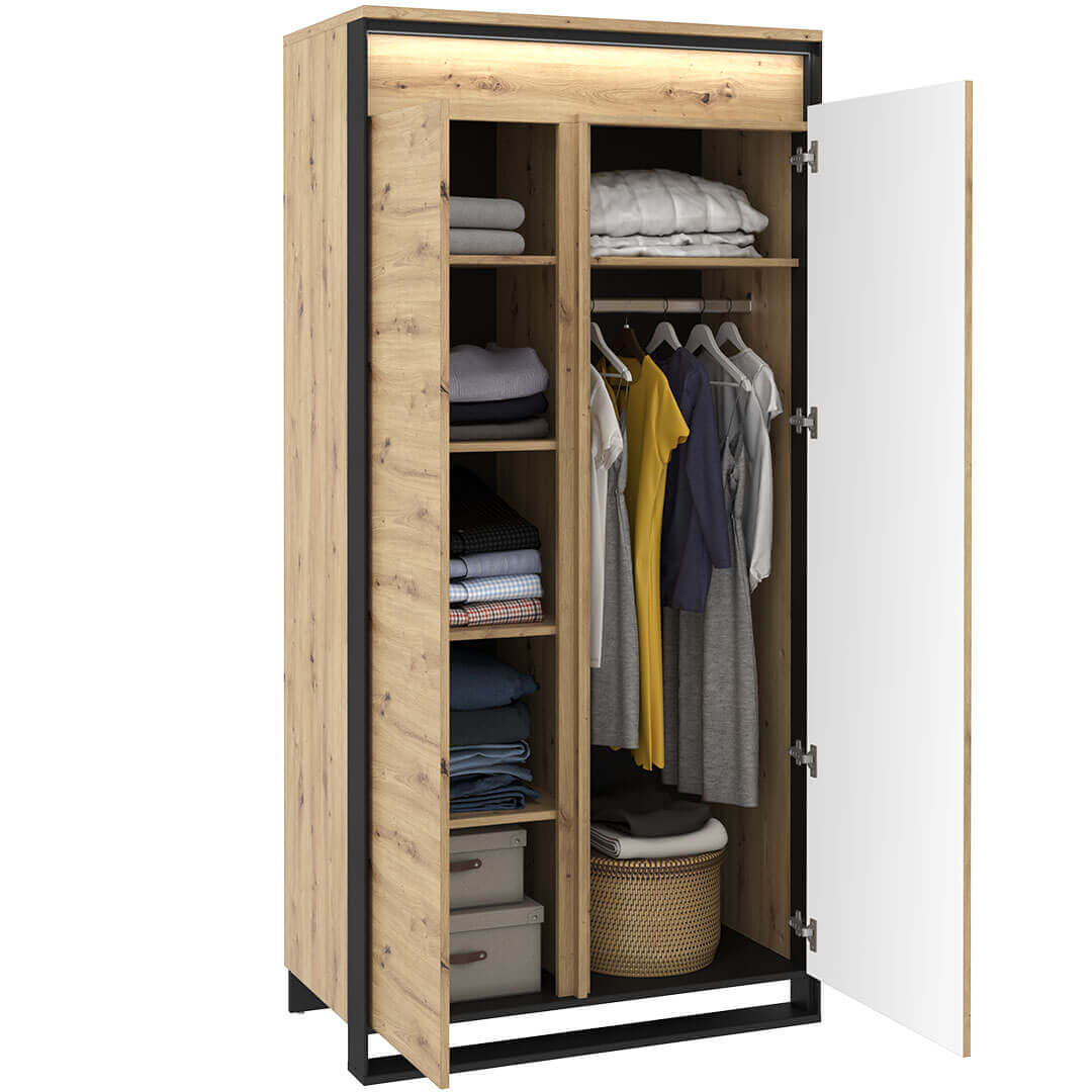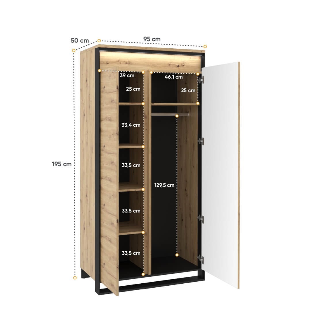Η ντουλάπα είναι σχεδιασμένη με μοντέρνο στυλ. Συνδυάζει αρμονικά το μοτίβο ξύλο με μαύρες λεπτομέρειες.