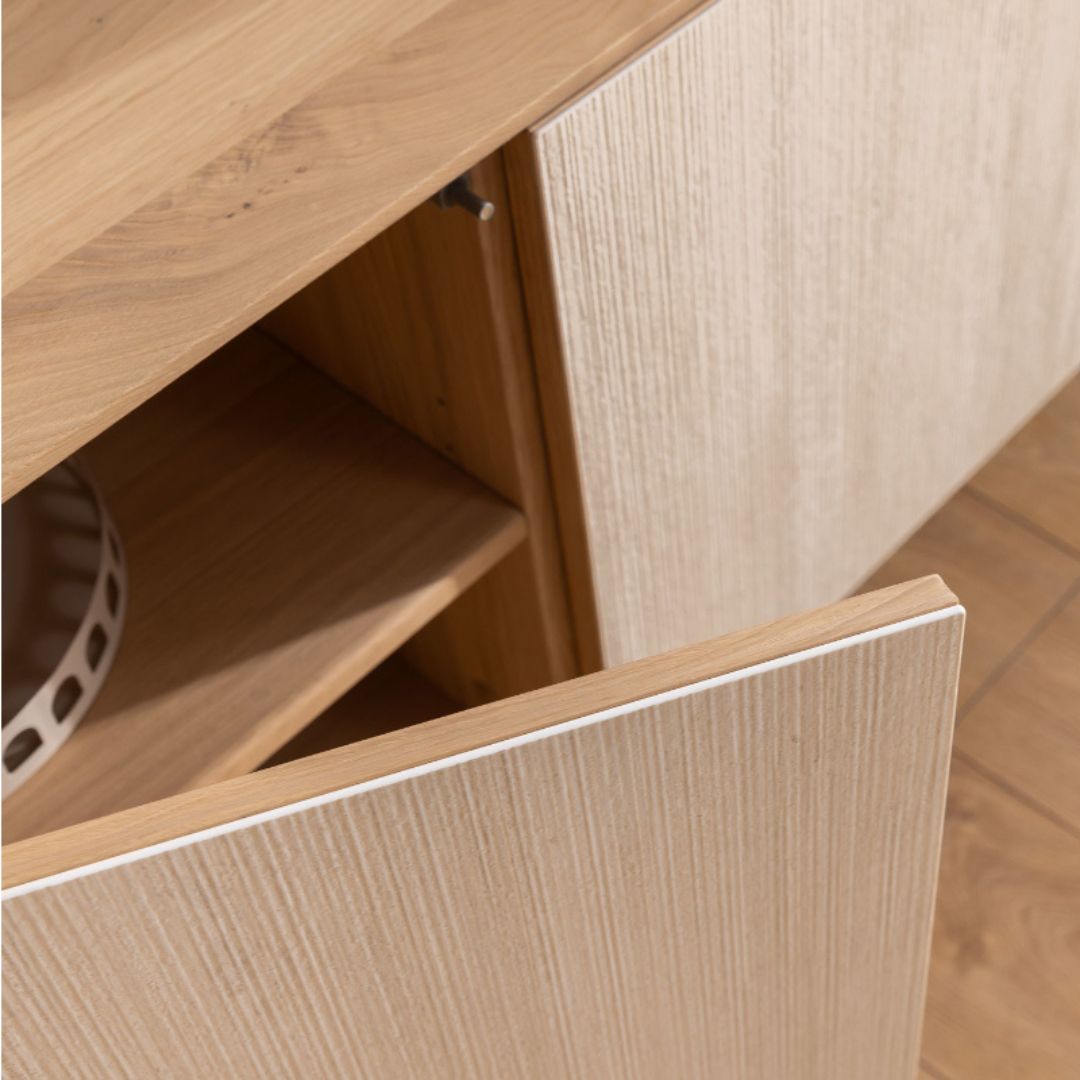 Οι προσόψεις των ντουλαπιών διατίθενται σε δύο επιλογές: συνθετικός χαλαζίας (sintered quartz), που προσδίδει μοντέρνο χαρακτήρα, ή μασίφ δρυς, που αναδεικνύει τη φυσική ομορφιά του ξύλου.
