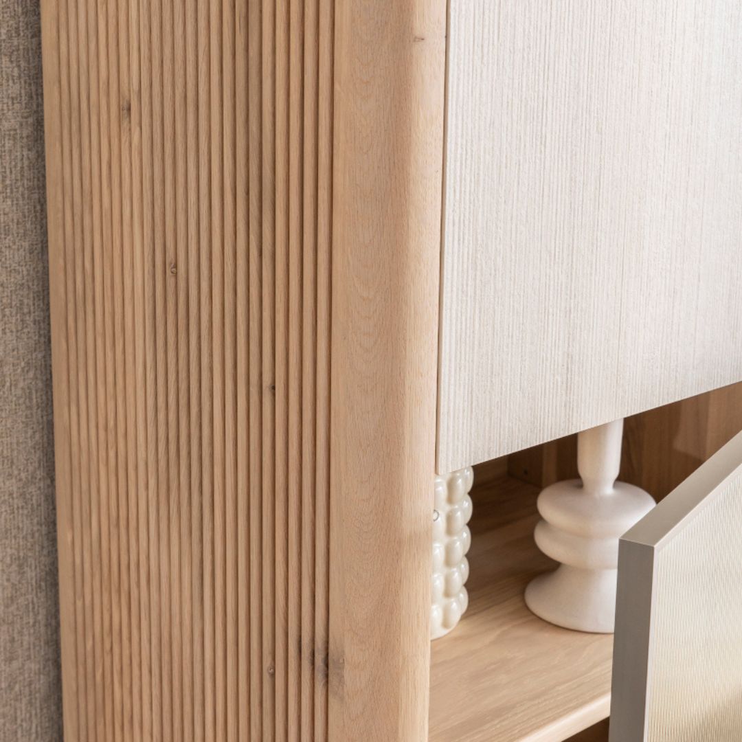 Στο εσωτερικό της, η βιτρίνα προσφέρει ευρύχωρα ράφια, συνδυάζοντας λειτουργικότητα με άφθονο αποθηκευτικό χώρο. Η κατασκευή στηρίζεται σε πόδια από μασίφ δρυ, τα οποία ολοκληρώνουν αρμονικά τη συνολική της εμφάνιση.