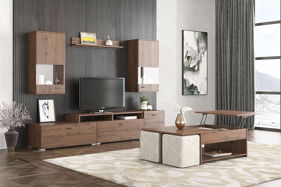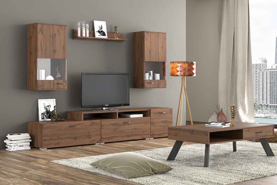 Σύνθεση σαλονιού αποτελούμενη από δύο κρεμαστές βιτρίνες, ένα έπιπλο τηλεόρασης και ένα ραφάκι.