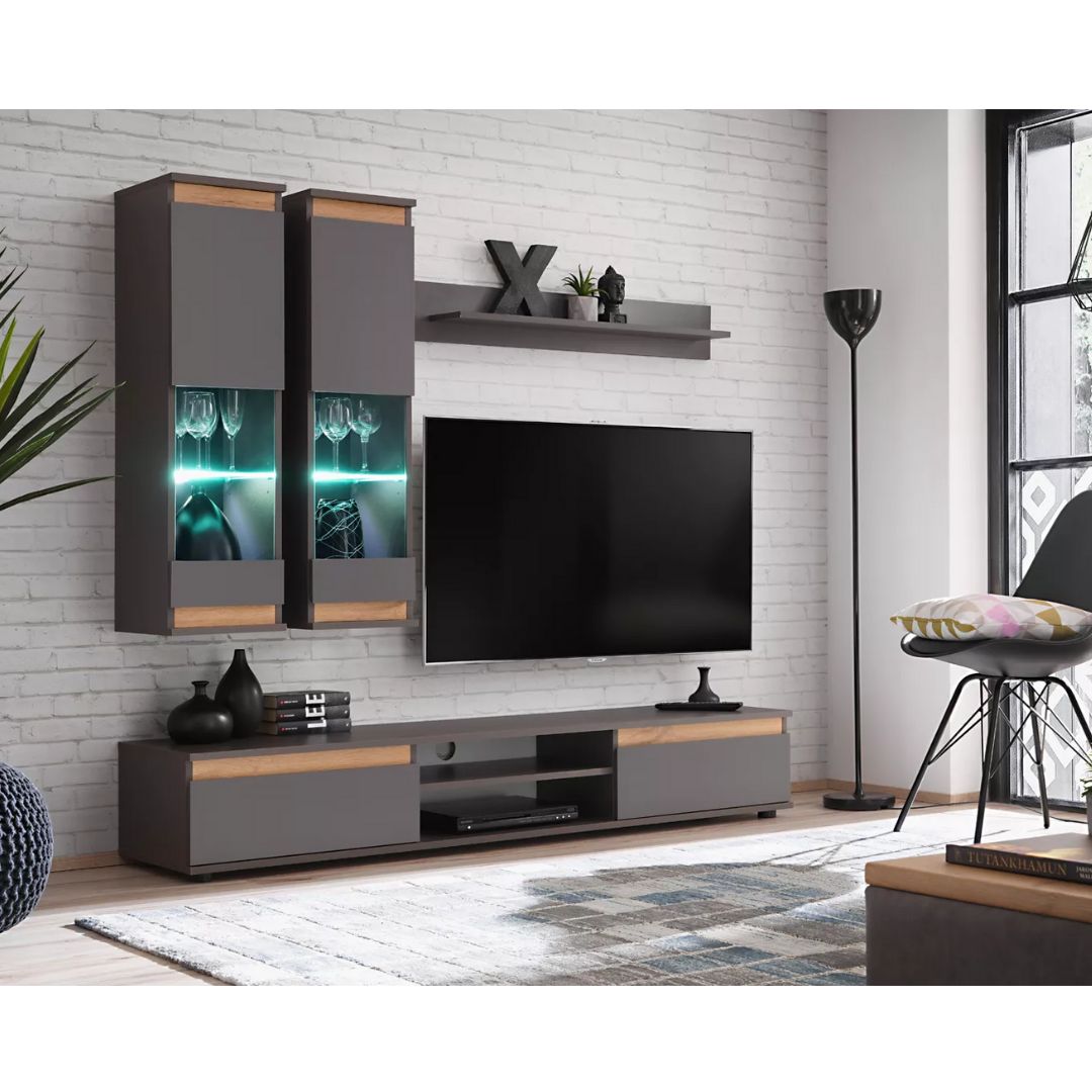 Εντυπωσιακή σύνθεση Modo σε ανθρακί απόχρωση με λεπτομέρειες στο φυσικό ξύλο δρυ! Μίνιμαλ μοντέρνος σχεδιασμός , με άριστη ποιότητα κατασκευής και εξαιρετική τιμή! Αποτελείται από ένα έπιπλο τηλεόρασης με δύο ανοιγόμενα ντουλάπια και ράφι στο κέντρο, δύο επιτοίχιες βιτρίνες με τζάμι και γυάλινα φωτιζόμενα ράφια για να εκθέτετε τα αγαπημένα σας αντικειμενα και ένα ράφι τοίχου σε ιδανική διάσταση που ολοκληρώνει τη σύνθεση.