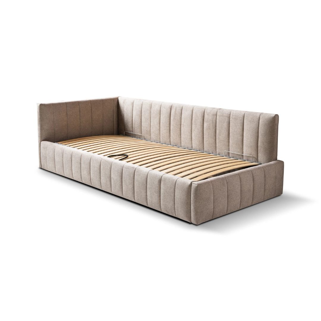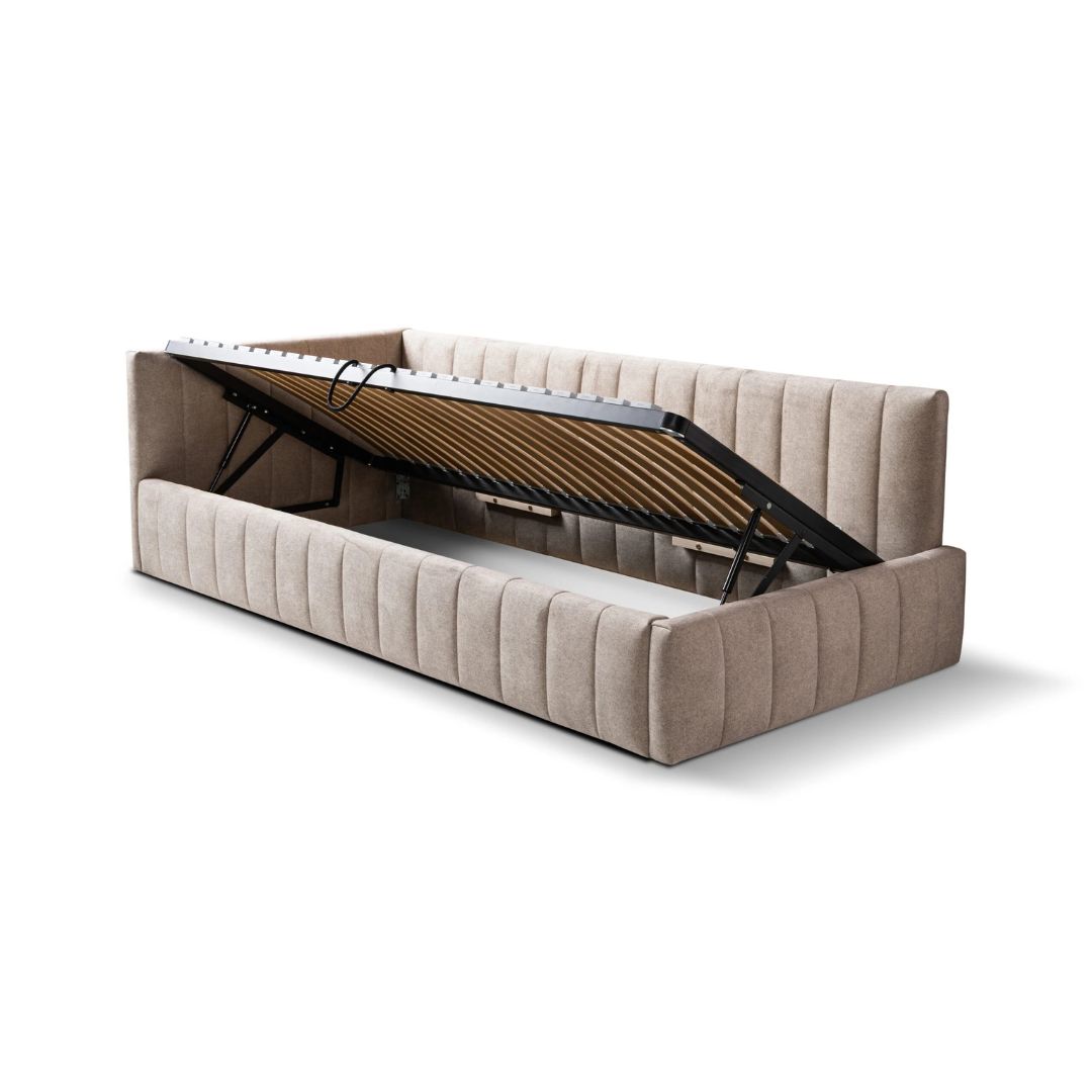 Πρόκειται για ένα μονό κρεβάτι με αποθηκευτικό χώρο και μηχανισμό ανύψωσης (πλαίσιο με χώρο αποθήκευσης κάτω από το στρώμα)